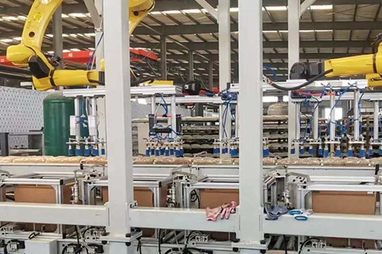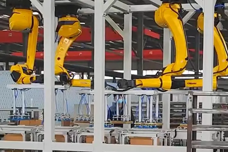 7. Les produits qualifiés entrent dans la station de palettisation et les produits sont placés sur les palettes hors de l'entrepôt de palettisation par le robot de palettisation. Une fois la palettisation terminée, les produits sont transportés jusqu'au lieu d'emballage via la chaîne de film d'emballage.